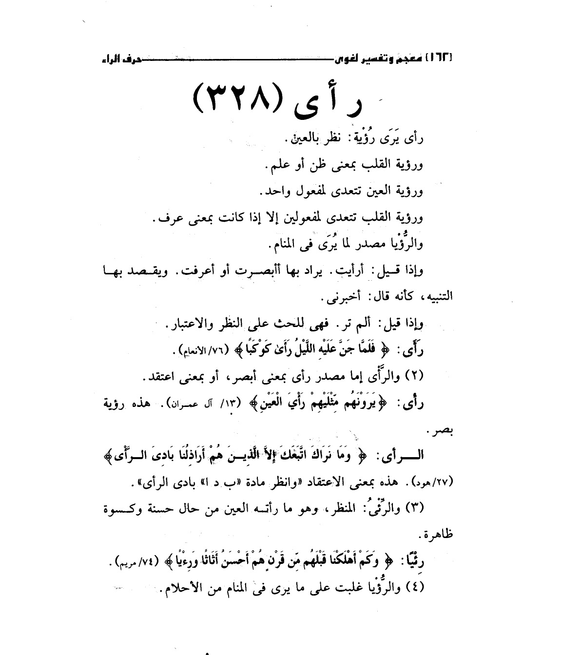 الرأي: (وَمَا نَرَاكَ اتَّبَعَكَ إِلاَّ الَّذِينَ هُمْ أَرَاذِلُنَا بَادِي الرَّأْيِ) " 27/هود" هذه بمعني الاعتقاد "وانظر مادة " ب د أ " باي الرأي".