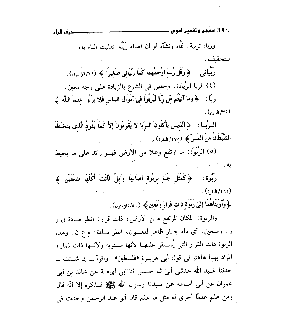 والربوة: المكان المرتفع من الأرض، ذات قرار: انظر مادة ق ر ر. ومعين أي ماء جار ظاهر للعيون، انظر مادة: م ع ن. وهذه الربوة ذات القرار التي يستقر عليها لأنها مستوية ولأنها ذات ثمار، المراد بها هاهنا في قول أبي هريرة "فلسطين"واقرأ-إن شئت-حدثنا عبد الله حدثني أبي ثنا حسن ثنا ابن لهيعة عن خالد بن أبي عمران عن أبي أمامة عن سيدنا رسول الله صلي الله عليه وسلم فذكره إلا أنه قال ومن علم علما أحري له مثل ما علم قال أبو عبد الرحمن وجدت في
