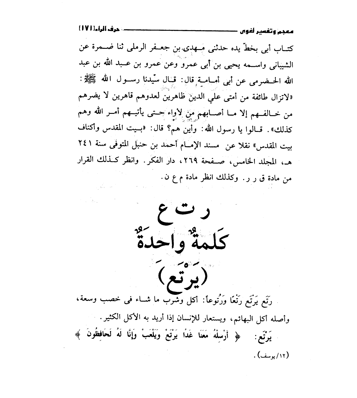 كتاب أبي بخط يده حدثني مهدي بن جعفر الرملي ثنا ضمرة عن الشيباني واسمه يحيي بن أبي عمرو وعن عمرو بن عبد الله بن عبد الله الحضرمي عن أبي أمامة قال: قال سيدنا رسول الله صلي الله عليه وسلم:"لا تزال طائفة من أمتي علي الدين ظاهرين لعدوهم قاهرين لا يضرهم من خالفهم إلا ما أصابهم من لأواء حتي يأتيهم أمر الله وهم كذلك" قالوا يارسول الله: وأين هم، قال:" بيت المقدس وأكناف بيت المقدس "نقلا عن مسند الإمام أحمد بن حنبل المتوفي سنة 241هـ، المجلد الخامس، صفحة 269،دار الفكر. وانظر كذلك القرار من مادة ق ر ر. وكذلك انظر مادة م ع ن.