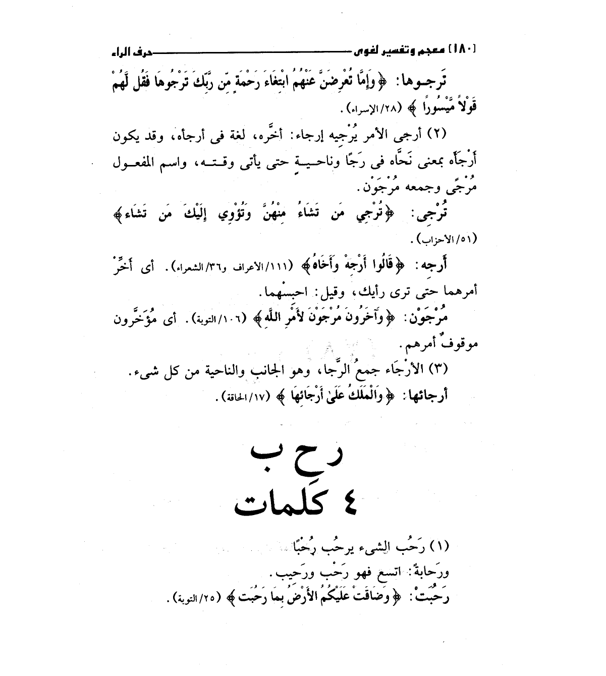 أرجه: (قَالُوا أَرْجِهِ وَأَخَاهُ) (111/الأعراف و 36 الشعراء). أى أخر أمرهما حتى ترى رأيك، وقيل: احسبها.