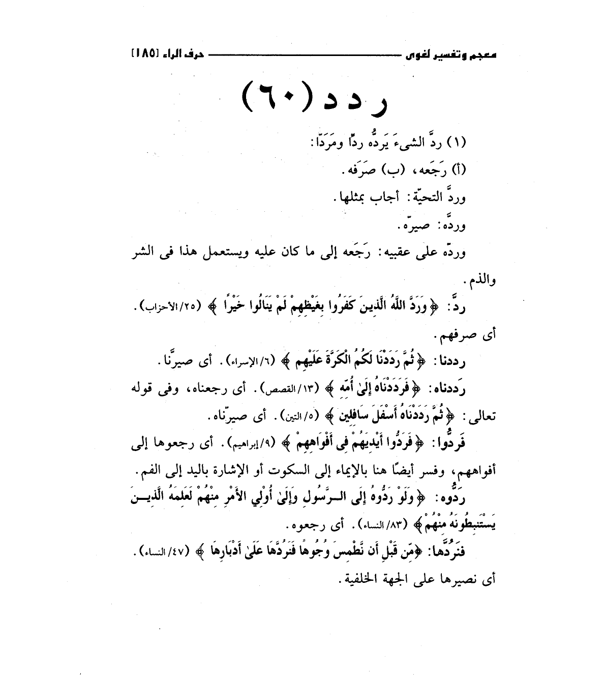 رد: (وَرَدَّ اللَّهُ الَّذِينَ كَفَرُوا بِغَيْظِهِمْ لَمْ يَنَالُوا خَيْراً) (25/الأحزاب) أى صرفهم.