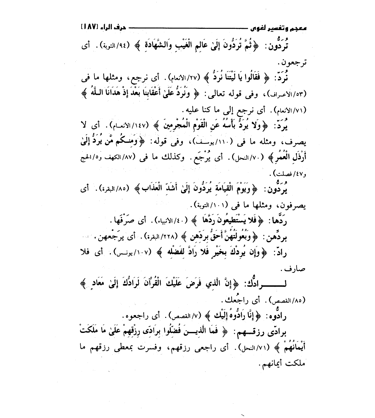 يرد: (وَلا يُرَدُّ بَأْسُهُ عَنْ الْقَوْمِ الْمُجْرِمِينَ) "147/الأنعام "أي لا يصرف، ومثله ما في (110/يوسف)،وفي قوله: (وَمِنْكُمْ مَنْ يُرَدُّ إِلَى أَرْذَلِ الْعُمُرِ) " 70/النحل" أي يرجع وكذلك ما في "87/الكهف و5/الحج و47/فصلت".