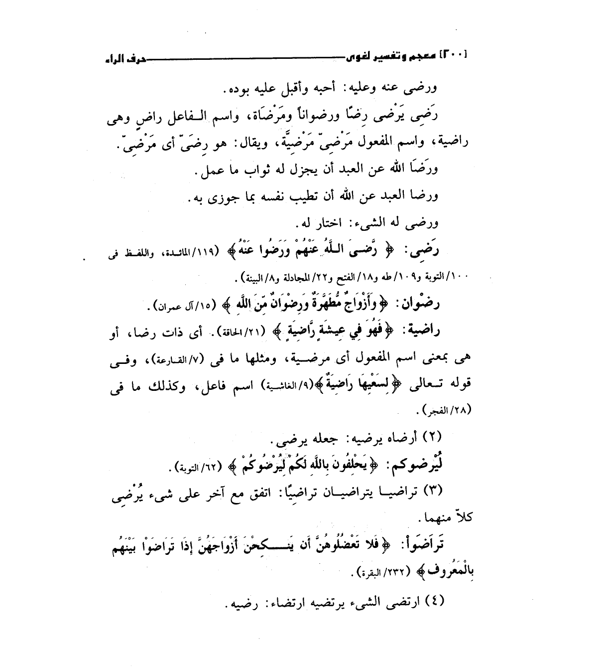 رضي: (رَضِيَ اللَّهُ عَنْهُمْ وَرَضُوا عَنْهُ) "119/المائدة، واللفظ في 100/التوبة و109/طه و18/الفتح و22/ المجادلة و8/البينة ".