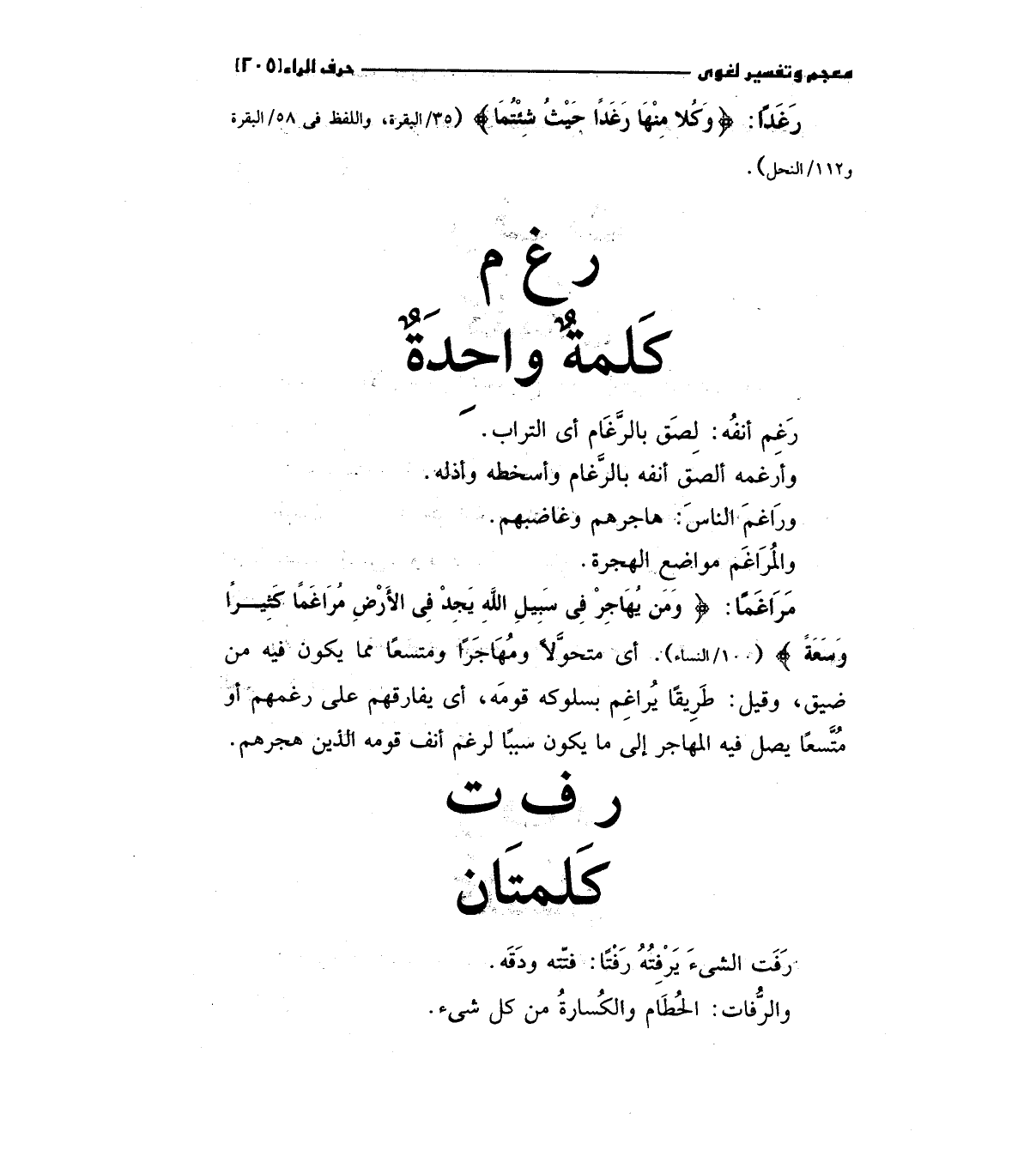 مراغما: (وَمَنْ يُهَاجِرْ فِي سَبِيلِ اللَّهِ يَجِدْ فِي الأَرْضِ مُرَاغَماً كَثِيراً وَسَعَةً) "100/النساء" أي متحولا ومهاجرا ومتسعا مما يكون فيه من ضيق، وقيل: طريقا يراغم بسلوكة قومه، أي يفارقهم علي رغمهم أو متسعا يصل فيه المهاجر إلي ما يكون سببا لرغم أنف قومه الذين هجرهم.
