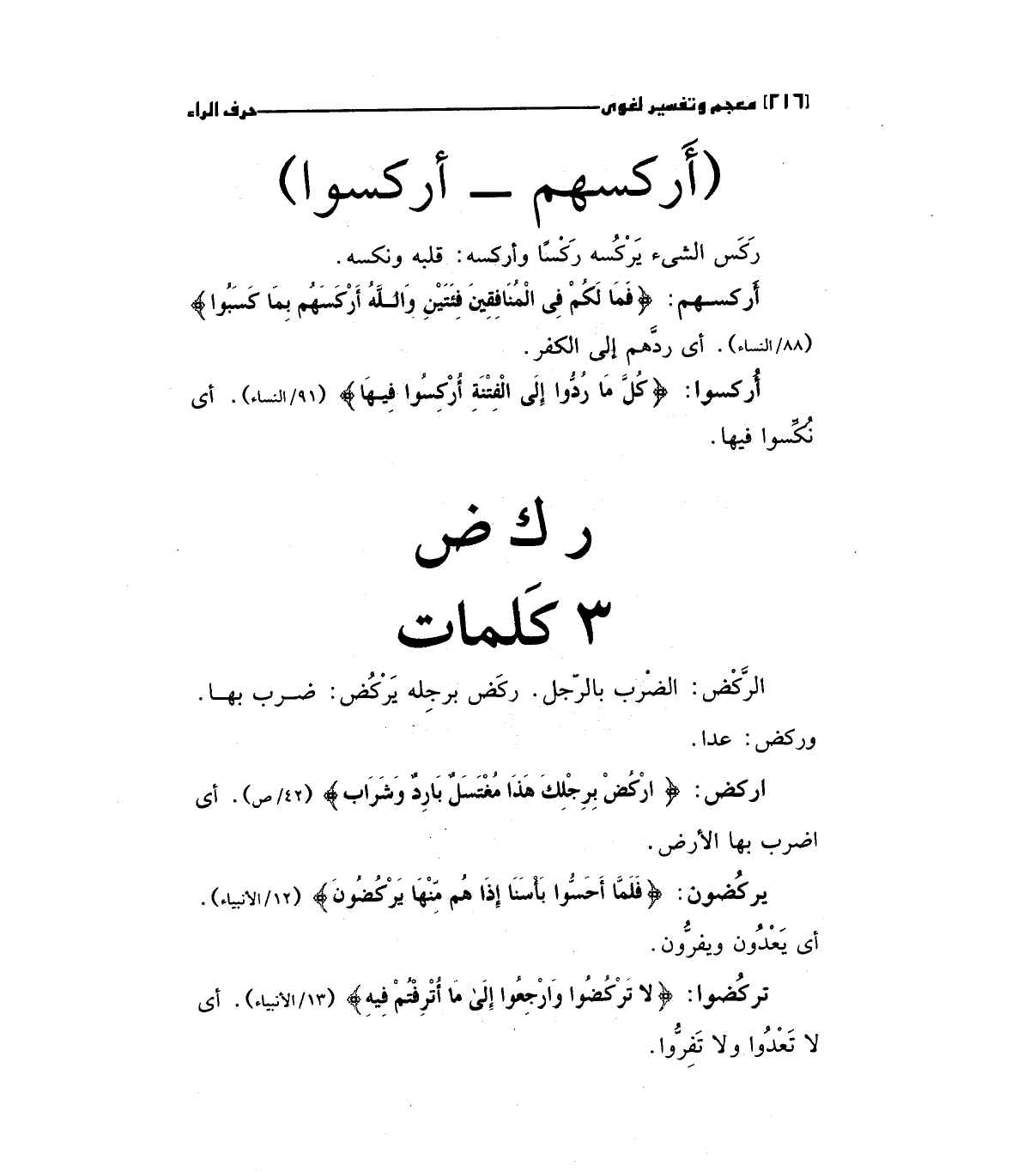 أركسهم: (فَمَا لَكُمْ فِي الْمُنَافِقِينَ فِئَتَيْنِ وَاللَّهُ أَرْكَسَهُمْ بِمَا كَسَبُوا) "88/النساء" أي ردهم إلي الكفر.