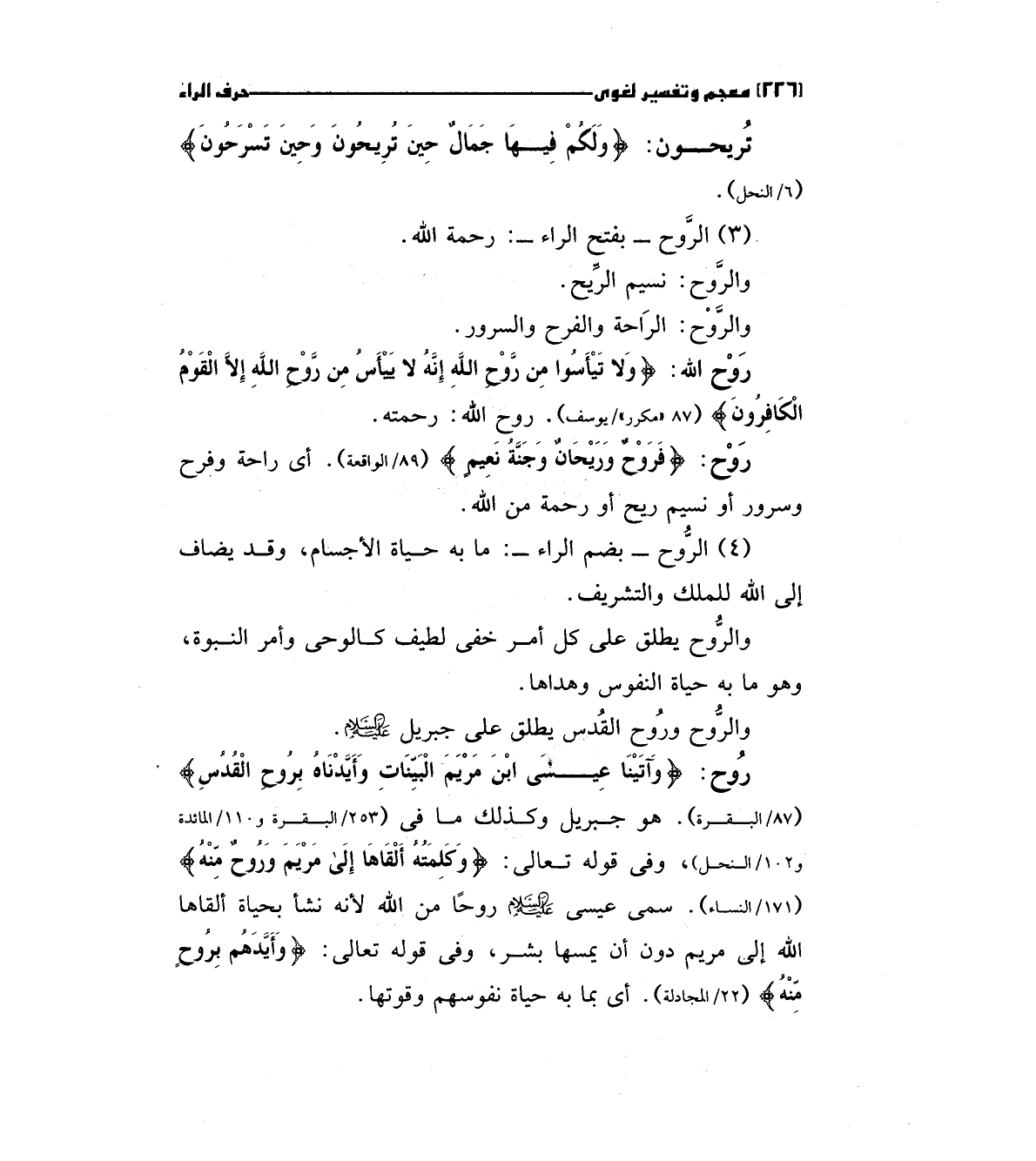 روح: (وَآتَيْنَا عِيسَى ابْنَ مَرْيَمَ الْبَيِّنَاتِ وَأَيَّدْنَاهُ بِرُوحِ الْقُدُسِ) " 87/البقرة" هو جبريل وكذلك ما في "253/البقرة و110/المائدة و102/النحل)، وفي قوله تعالي: (وَكَلِمَتُهُ أَلْقَاهَا إِلَى مَرْيَمَ وَرُوحٌ مِنْهُ) " 171/النساء" سمي عيسي عليه السلام روحا من الله لأنه نشأ بحياة ألقاها الله إلي مريم دون أن يمسها بشر، وفي قوله تعالي: (وَأَيَّدَهُمْ بِرُوحٍ مِنْهُ) "22/المجادلة " اي بما به حياة نفوسهم وقوتها.
