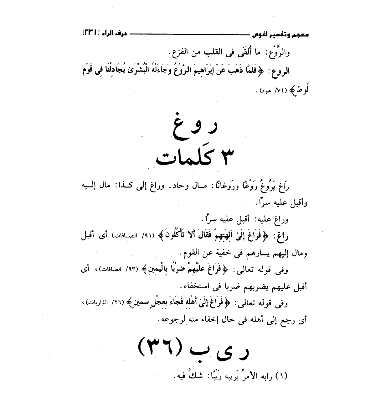 راغ: (فَرَاغَ إِلَى آلِهَتِهِمْ فَقَالَ أَلا تَأْكُلُونَ) "91/الصافات" أي أقبل ومال إليهم يسارهم في خفية عن القوم.