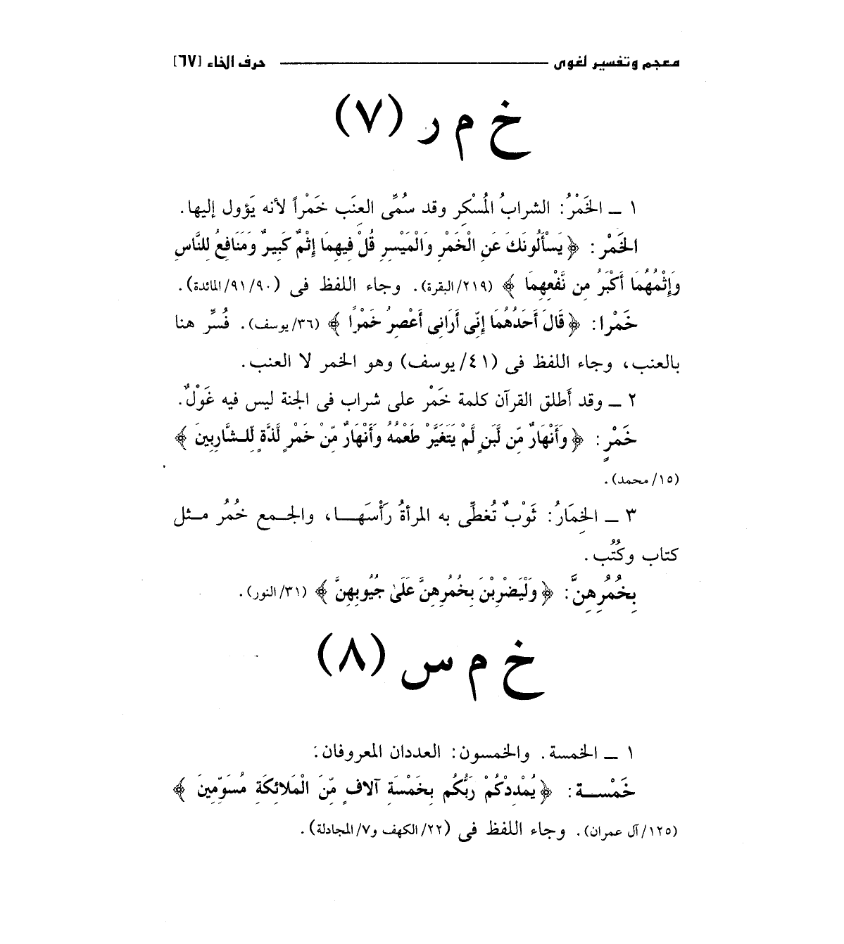 الخمر: (يَسْأَلُونَكَ عَنْ الْخَمْرِ وَالْمَيْسِرِ قُلْ فِيهِمَا إِثْمٌ كَبِيرٌ وَمَنَافِعُ لِلنَّاسِ وَإِثْمُهُمَا أَكْبَرُ مِنْ نَفْعِهِمَا) " 219/البقرة " وجاء اللفظ في (90/ 91/المائدة) خمرا: (قَالَ أَحَدُهُمَا إِنِّي أَرَانِي أَعْصِرُ خَمْراً) " 36/يوسف" فسر هنا بالعنب، وجاء اللفظ في " 41/يوسف " وهو الخمر لا العنب.