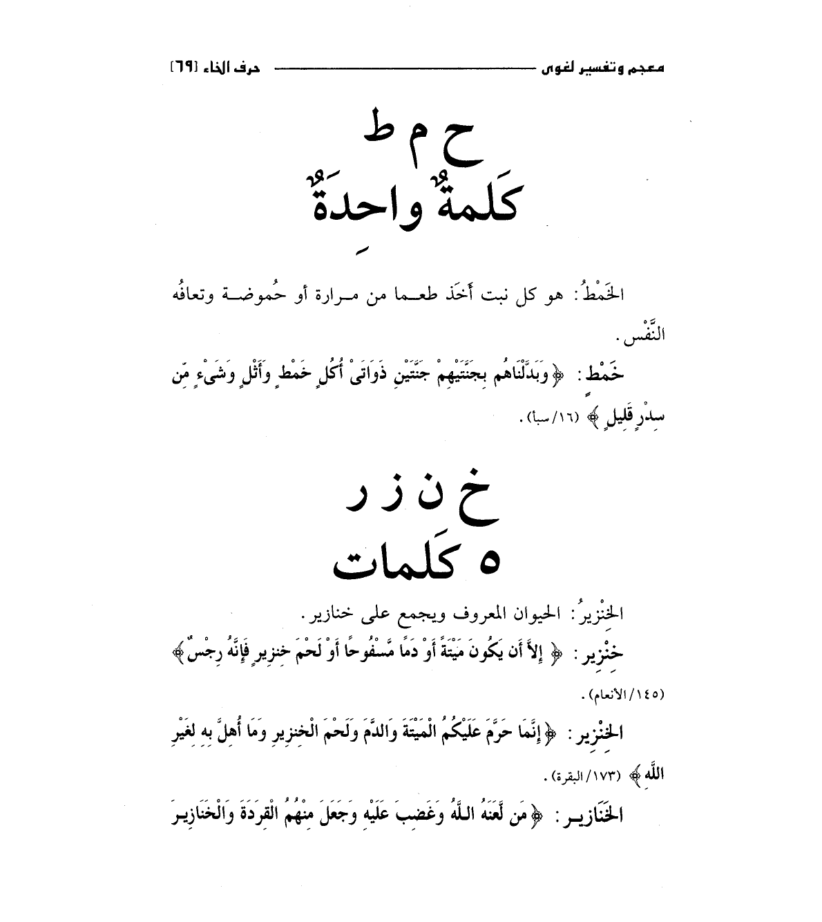 خمط: (وَبَدَّلْنَاهُمْ بِجَنَّتَيْهِمْ جَنَّتَيْنِ ذَوَاتَى أُكُلٍ خَمْطٍ وَأَثْلٍ وَشَيْءٍ مِنْ سِدْرٍ قَلِيلٍ) " 16/سبأ".