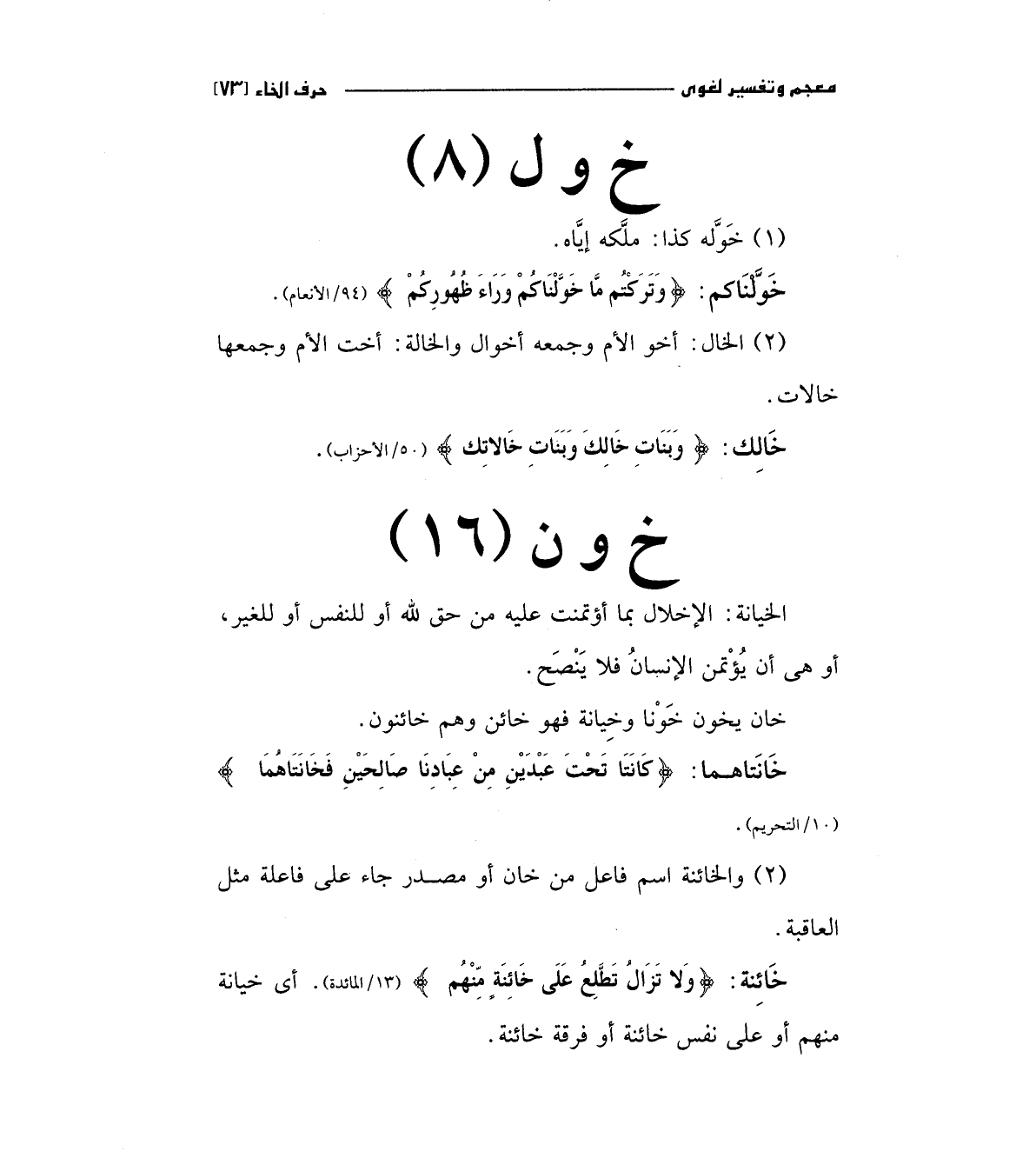 خائنة: (وَلا تَزَالُ تَطَّلِعُ عَلَى خَائِنَةٍ مِنْهُمْ) "13/المائدة " أي خيانة منهم أو علي نفس خائنة أو فرقة خائنة.