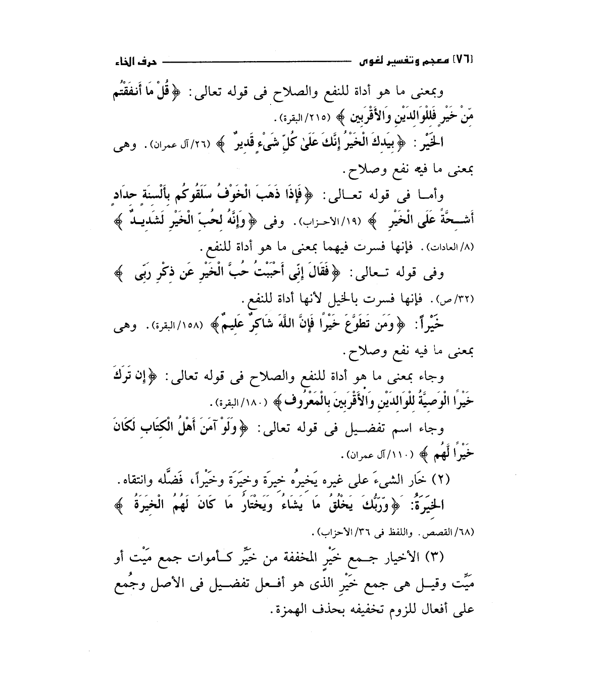 وأما في قوله تعالي: (فَإِذَا ذَهَبَ الْخَوْفُ سَلَقُوكُمْ بِأَلْسِنَةٍ حِدَادٍ أَشِحَّةً عَلَى الْخَيْرِ) "19/الأحزاب" وفي (وَإِنَّهُ لِحُبِّ الْخَيْرِ لَشَدِيدٌ) " 8/العادات " فإنها فسرت فيهما بمعني ما هو أداة للنفع.