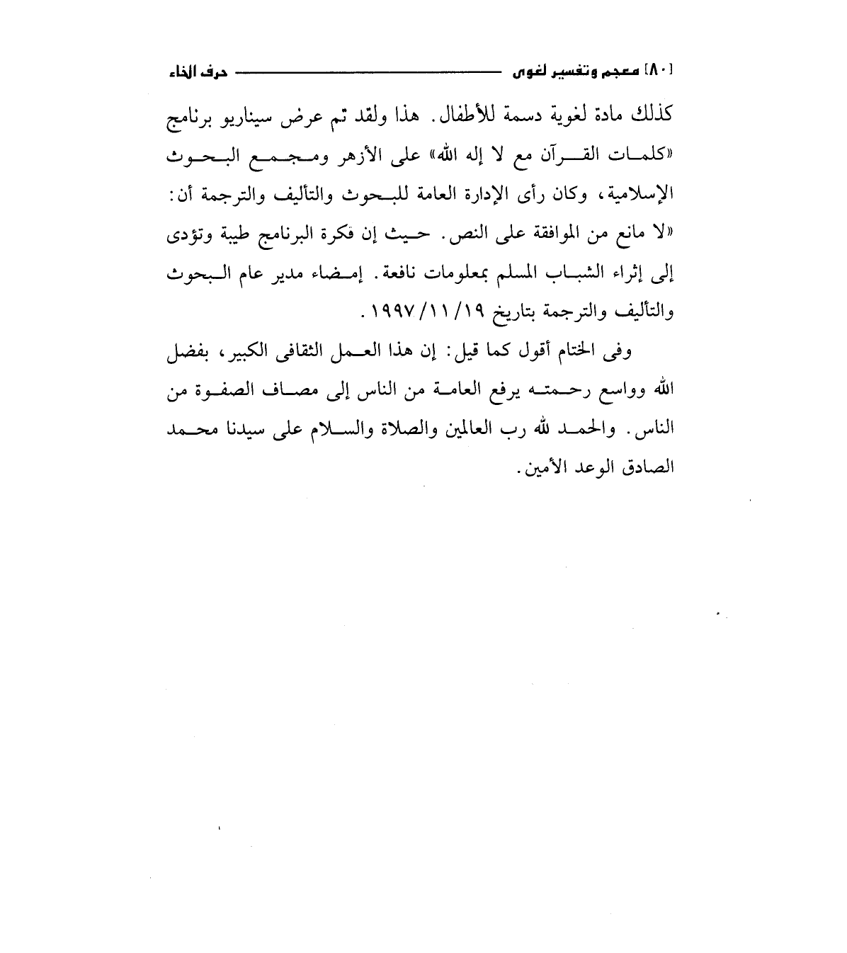 كذلك مادة لغوية دسمة للأطفال. هذا ولقد تم عرض سيتاريو برنامج " كلمات القرآن مع لا إله الله " على الأزهر ومجمع البحوث الإسلامية، وكان راى الإدارة العامة للبحوث والتأليف والترجمة أن: " لا مانع من الموافقة على النص. حيث إن فكرة البرنامج طيبة وتؤدى إلى إثراء الشباب المسلم بمعلومات نافعة إمضاء مدير عام البحوث والتأليف والترجمة بتاريخ 19/ 11/1997.