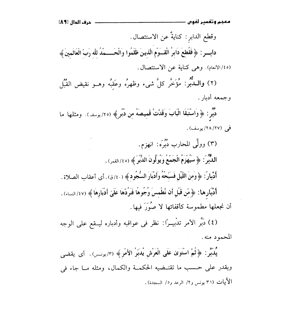دابر: " فَقُطِعَ دَابِرُ الْقَوْمِ الَّذِينَ ظَلَمُوا وَالْحَمْدُ لِلَّهِ رَبِّ الْعَالَمِينَ " (45/ الأنعام) وهى كناية عن الاستئصال.