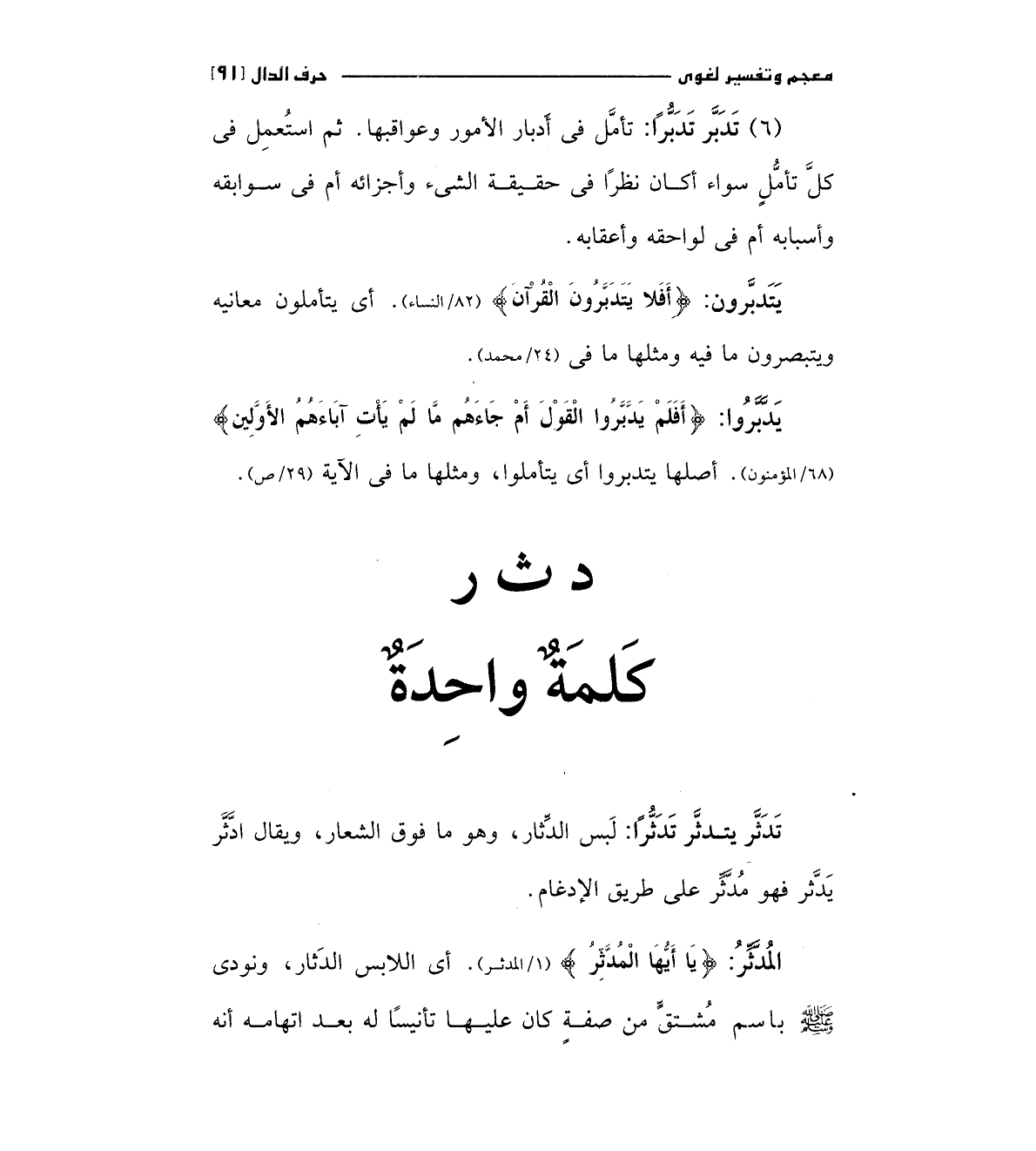 6 - تدبر تدبرا: تأمل في أدبار الأمور وعواقبها ثم استعمل في كل تأمل سواء أكان نظرا في حقيقة الشئ وأجزائه أم في سوابقه وأسبابه أم في لواحقه وأعقابه.