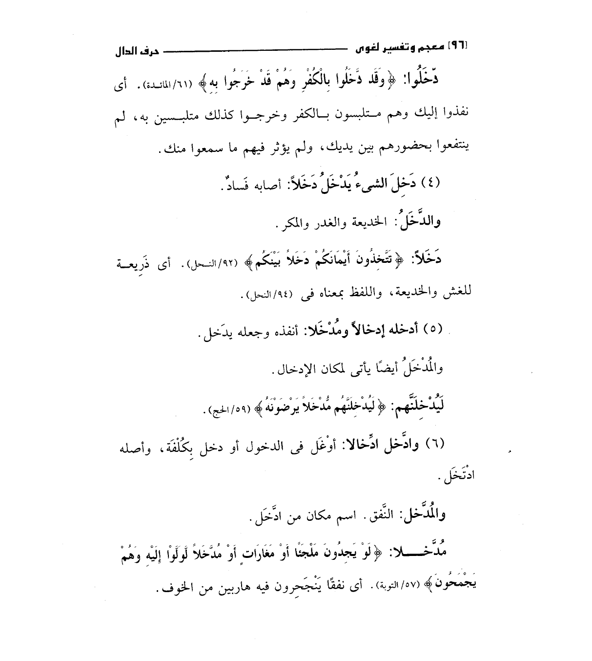 دخلا: (تَتَّخِذُونَ أَيْمَانَكُمْ دَخَلاً بَيْنَكُمْ) " 92/النحل " أي ذريعة للغش والخديعة، واللفظ بمعناه في " 94/النحل.
