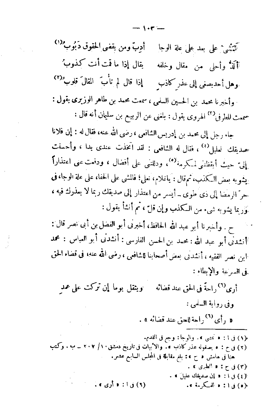 جاء رجل إلى محمد بن إدريس الشافعي، رضي الله عنه، فقال له: إن فلانا صديقك لعليل (٤)، فقال له الشافعي: لقد اتخذت عندي يدا، وأحسنت إليّ حيث أيقظتني لمكرمة (٥)، ودللتني على إفضال، ودفعت عني اعتذاراً يشوبه بعض الكذب، ثم قال: يا غلام، نعلي؛ فالمشي على الحفا، على علة الوجا، في حرّ الرمضا إلى ذي طوى - أيسر من اعتذار إلى صديقك ربما لا يعذرك فيه، وربما يشوبه شيء من الكذب وإن قلّ، ثم أنشأ يقول: