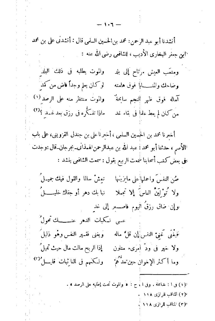 أنشدنا أبو عبد الرحمن: محمد بن الحسين السلمي قال: أنشدني علي بن محمد ابن جعفر البخاري الأديب، للشافعي رضي الله عنه:
