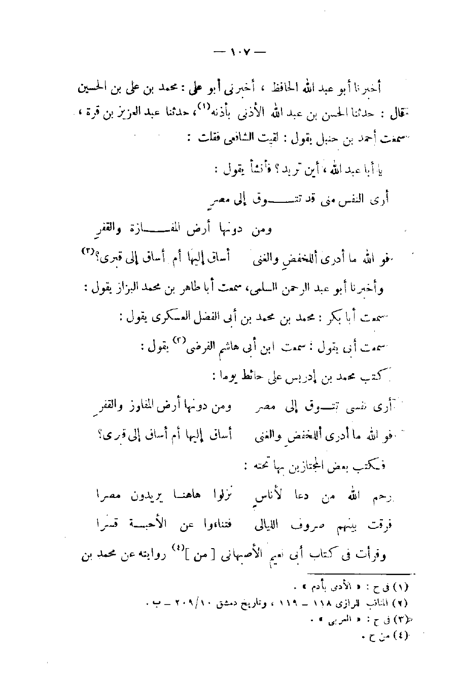أخبرنا أبو عبد الله الحافظ، أخبرني أبو علي: محمد بن علي بن الحسين قال: حدثنا الحسن بن عبد الله الأذني بأَذنة (١)، حدثنا عبد العزيز بن قرة، سمعت أحمد بن حنبل يقول: لقيت الشافعي فقلت: