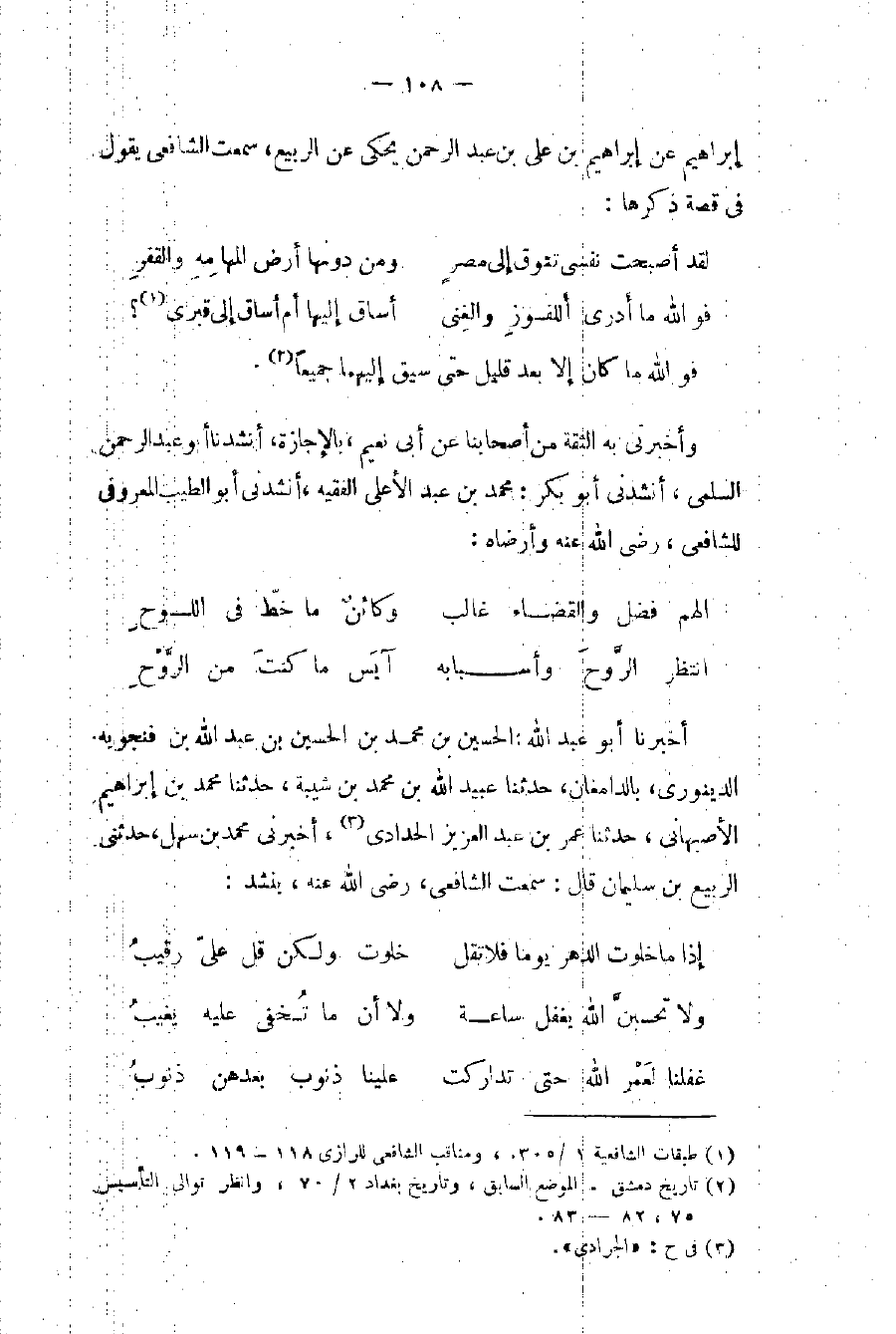 وأخبرني به الثقة من أصحابنا عن أبي نعيم، بالإجازة، أنشدنا أبو عبد الرحمن السلمي، أنشدني أبو بكر: محمد بن عبد الأعلى الفقيه، أنشدني أبو الطيب المعروفي للشافعي، رضي الله عنه وأرضاه: