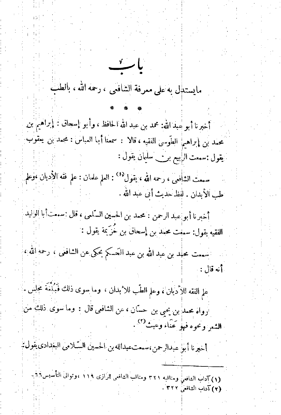 سمعت الشافعي، رحمه الله، يقول (١): العلم علمان: علم فقد الأديان، وعلم طب الأبدان. لفظ حديث أبي عبد الله.