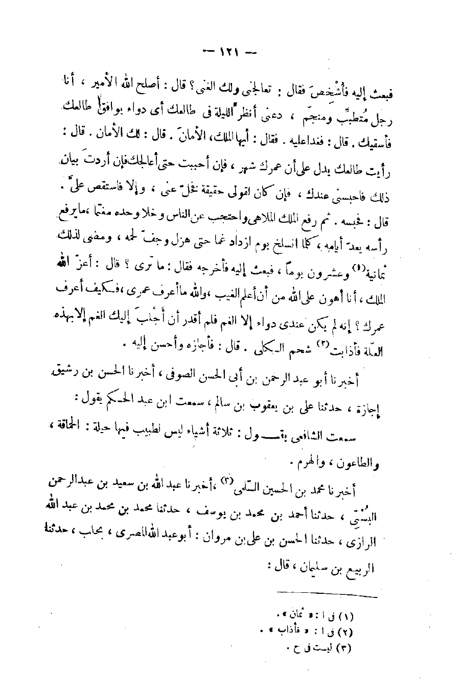 فبعث إليه فأُشْخِصَ فقال: تعالجني ولك الغنى؟ قال: أصلح الله الأمير، أنا رجل مُتطبِّب ومنجّم، دعني أنظر الليلة في طالعك أي دواء يوافق طالعك فأسقيك. قال: فغدا عليه. فقال: أيها الملك، الأمانَ. قال: لك الأمان. قال: رأيت طالعك يدل على أن عمرك شهر، فإن أحببت حتى أعالجك فإن أردتَ بيان ذلك فاحبسني عندك، فإن كان لقولي حقيقة فحلّ عني، وإلا فاستقص عليَّ. قال: فحبسه. ثم رفع الملك الملاهي واحتجب عن الناس وخلا وحده مغتمًّا، ما يرفع رأسه يعدّ أيامه، كلما انسلخ يوم ازداد غما حتى هزل وجفّ لحمه، ومضى لذلك ثمانية (١) وعشرون يوماً، فبعث إليه فأخرجه فقال: ما ترى؟ قال: أعزّ الله الملك، أنا أهون على الله من أن أعلم الغيب، والله ما أعرف عمري، فكيف أعرف عمرك؟ إنه لم يكن عندي دواء إلا الغم فلم أقدر أن أَجْلبَ إليك الغم إلا بهذه العلّة فأذابت (٢) شحم الكلى. قال: فأجازه وأحسن إليه.
