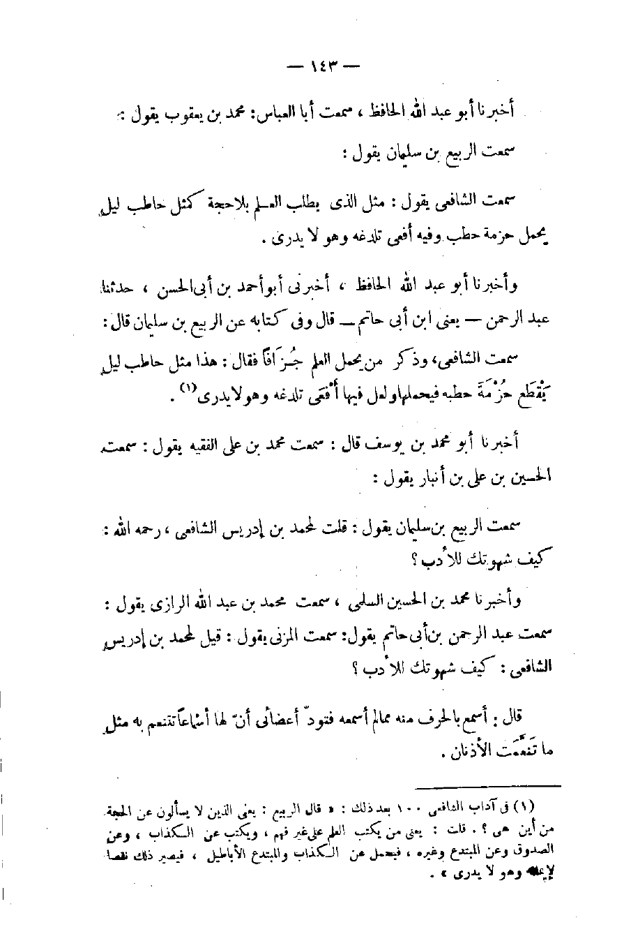 (١) في آداب الشافعي ١٠٠ بعد ذلك: «قال الربيع: يعني الذين لا يسألون عن الحجة من أين هي؟. قلت: يعني من يكتب العلم على غير فهم، ويكتب عن الكذاب، وعن الصدوق وعن المبتدع وغيره، فيحمل عن الكذاب والمبتدع والأباطيل، فيصير ذلك نقصا لإيمانه وهو لا يدري».