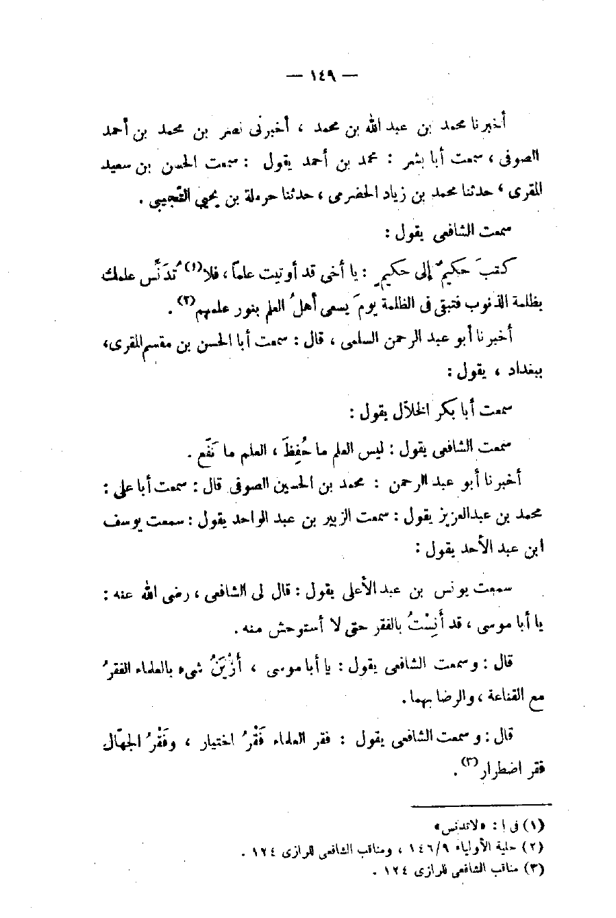 (٢) حلية الأولياء ٩/ ١٤٦، ومناقب الشافعي للرازي ١٢٤.
