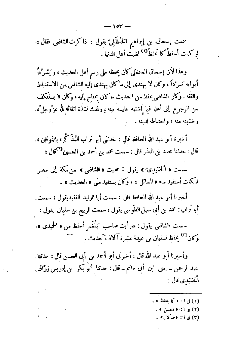 وهذا لأن إسحاق الحنظلي كان يحفظه على رسم أهل الحديث، ويَسْرُدُ أبوابه سَرْداً، وكان لا يهتدي إلى ما كان يهتدي إليه الشافعي من الاستنباط والفقه. وكان الشافعي يحفظ من الحديث ما كان يحتاج إليه، وكان لا يستنكف من الرجوع إلى أهله فيما اشتبه عليه منه؛ وذلك لشدة اتقائه لله عز وجلّ، وخشيته منه، واحتياطه لدينه.