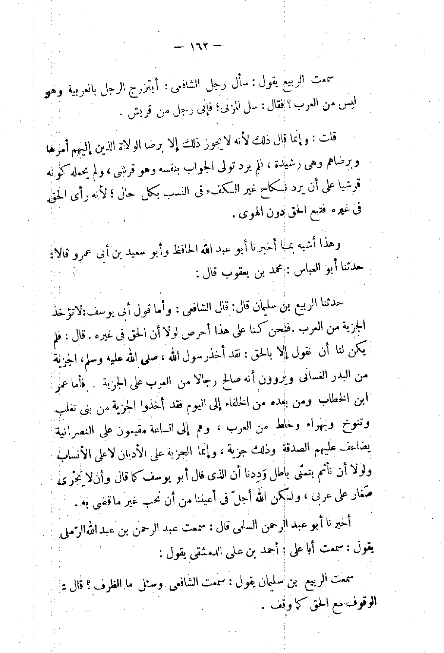 حدثنا الربيع بن سليمان قال: قال الشافعي: وأما قول أبي يوسف: لا تؤخذ الجزية من العرب. فنحن كنا على هذا أحرص لولا أن الحق في غيره. قال: فلم يكن لنا أن نقول إلا بالحق: لقد أخذ رسول الله، صلى الله عليه وسلم، الجزية من البدر الغساني ويروون أنه صالح رجالا من العرب على الجزية. فأما عمر ابن الخطاب ومن بعده من الخلفاء إلى اليوم فقد أخذوا الجزية من بني تعلب وتنوخ وبهراء وخلط من العرب، وهم إلى الساعة مقيمون على النصرانية يضاعف عليهم الصدقة وذلك جزية، وإنما الجزية على الأديان لا على الأنساب ولولا أن نأثم بتمنّي باطل وَدِدنا أن الذي قال أبو يوسف كما قال وأن لا يَجْري صَغار على عربي، ولكن الله أجلّ في أعيننا من أن نحب غير ما قضى به.