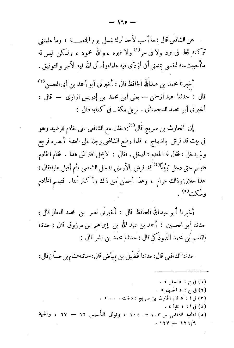 (٥) آداب الشافعي ص ١٠٣ - ١٠٤، وتوالي التأسيس ٦٦ - ٦٧، والحلية ٩/ ١٢٦ - ١٢٧.