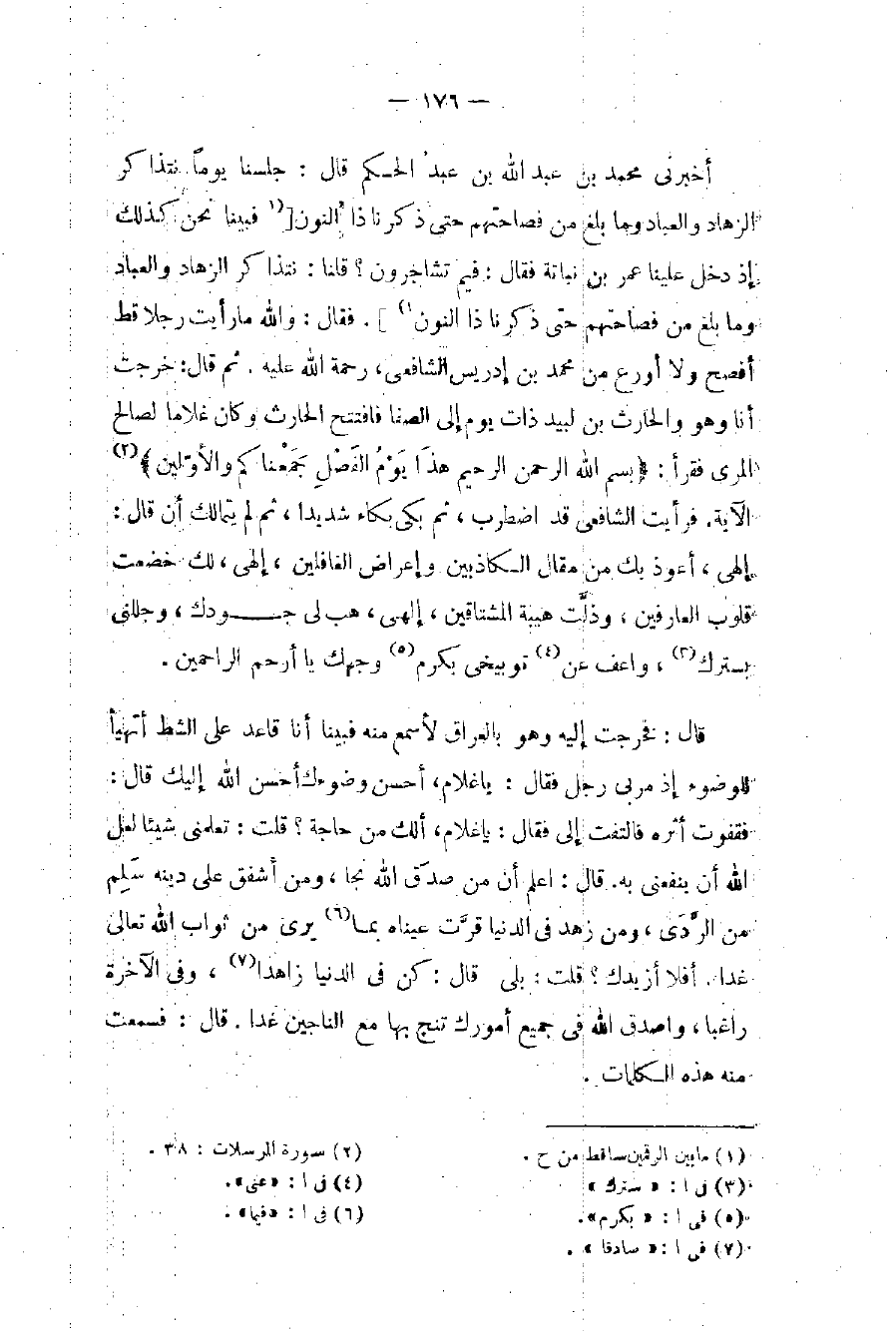 أخبرني محمد بن عبد الله بن عبد الحكم قال: جلسنا يوماً نتذاكر الزهاد والعباد وما بلغ من فصاحتهم حتى ذكرنا ذا النون [(١ فبينا نحن كذلك إذ دخل علينا عمر بن نباتة فقال: فيم تشاجرون؟ قلنا: نتذاكر الزهاد والعباد وما بلغ من فصاحتهم حتى ذكرنا ذا النون ١)]. فقال: والله ما رأيت رجلا قط أفصح ولا أورع من محمد بن إدريس الشافعي، رحمة الله عليه. ثم قال: خرجت أنا وهو والحارث بن لبيد لذات يوم إلى الصفا فافتتح الحارث وكان غلاما لصالح المرى فقرأ: {بسم الله الرحمن الرحيم هَذَا يَوْمُ الْفَصْلِ جَمَعْنَاكُمْ وَالْأَوَّلِينَ} (٢) الآية، فرأيت الشافعي قد اضطرب، ثم بكى بكاء شديدا، ثم لم يتمالك أن قال: إلهي، أعوذ بك من مقال الكاذبين وإعراض الغافلين، إليه، لك خضعت قلوب العارفين، وذلَّت هيبة المشتاقين، إلهي، هب لي جودك، وجللني بسترك (٣)، واعف عن (٤) توبيخي بكرم (٥) وجهك يا أرحم الراحمين.