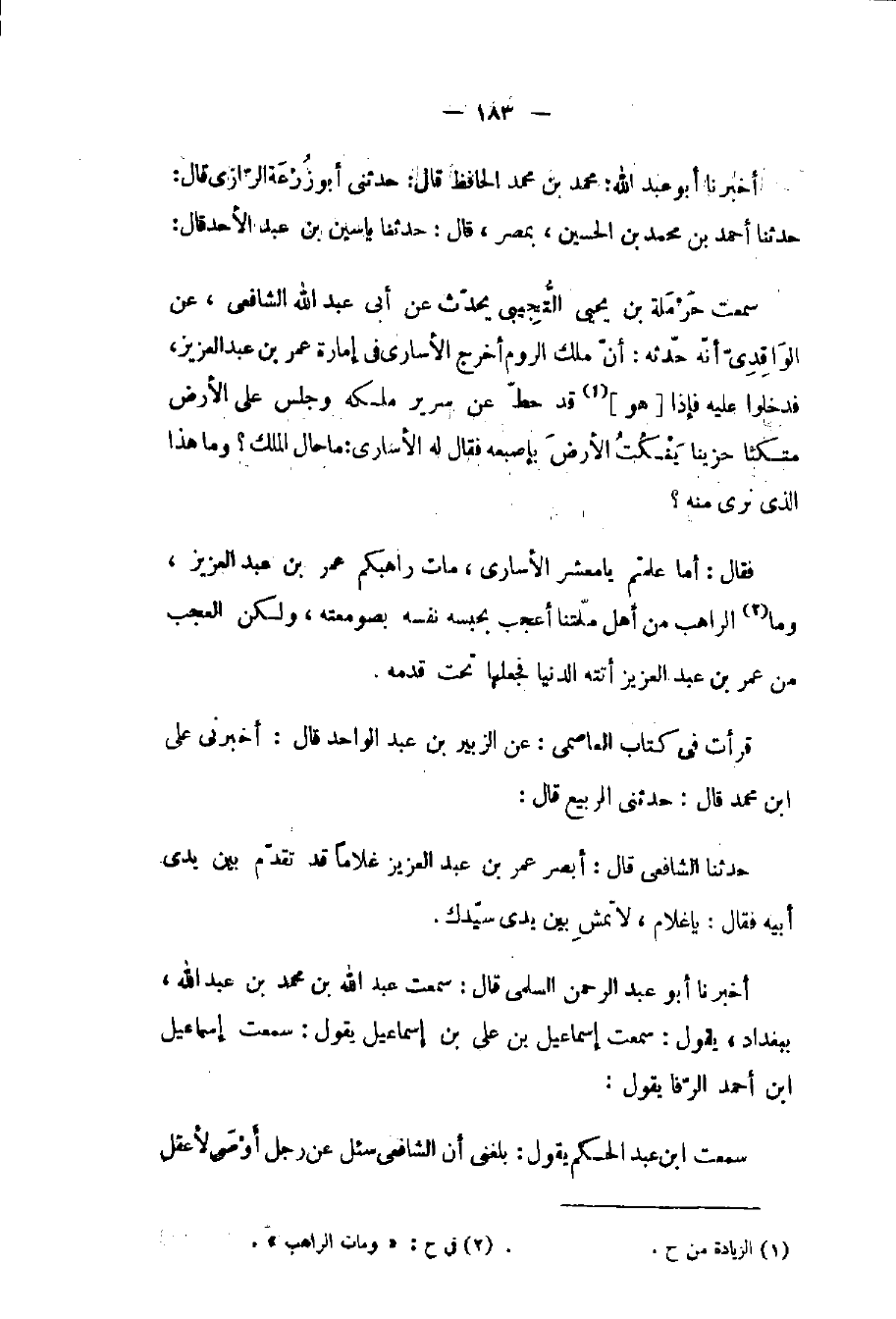 سمعت حَرْمَلة بن يحيى التُّجِيبي يحدّث عن أبي عبد الله الشافعي، عن الوَاقِدِيّ أنّه حدّثه: أنّ ملك الروم أخرج الأسارى في إمارة عمر بن عبد العزيز، فدخلوا عليه فإذا [هو] (١) قد حطّ عن سرير ملكه وجلس على الأرض متكئا حزينا يَنْكُتُ الأرضَ بإصبعه فقال له الأسارى: ما حال الملك؟ وما هذا الذي نرى منه.