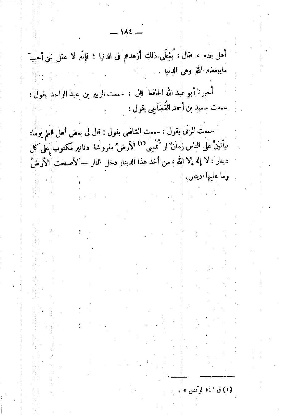 سمعت المزني يقول: سمعت الشافعي يقول: قال لي بعض أهل العلم يوما: ليأتيَنَّ على الناس زمانٌ لو تُمْسيِ (١) الأرضُ مفروشة دنانير مكتوب على كل دينار: لا إله إلا الله، من أخذ هذا الدينار دخل النار - لأصبحت الأرضُ وما عليها دينار.