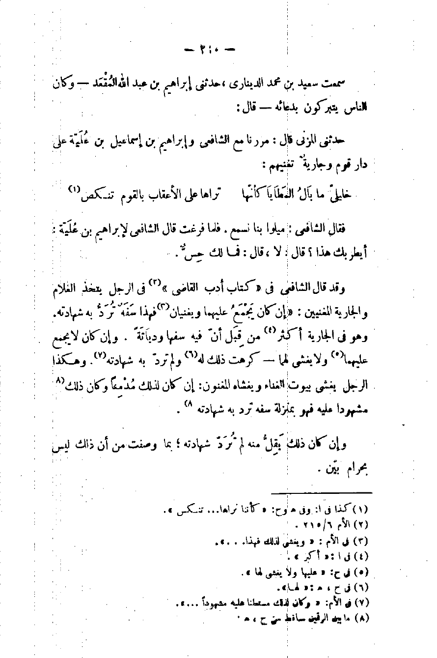 وقد قال الشافعي في «كتاب أدب القاضي» (٢) في الرجل يتخذ الغلام والجارية المغنيين: «إن كان يَجْمَعُ عليهما ويغنيان (٣) فهذا سَفَهٌ تُرَدُّ به شهادته. وهو في الجارية أكثر (٤) من قِبَل أنّ فيه سفها وديَاثَةً. وإن كان لا يجمع عليهما (٥) ولا يغشى لهما - كرهت ذلك له (٦) ولم تردّ به شهادته (٧). وهكذا الرجل يغشى بيوت الغناء ويغشاه المغنون: إن كان لذلك مُدْمِعاً وكان ذلك (٨ مشهودا عليه فهو بمنزلة سفه ترد به شهادته ٨).