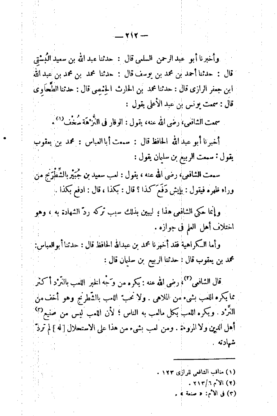 قال الشافعي (٢)، رضي الله عنه: يكره من وَجْه الخبر اللعب بالنّرْد أكثر مما يكره اللعب بشيء من الملاهي. ولا نحبّ اللعب الشّطرنج وهو أخف من النَّرْد. ويكره اللعب بكل ما لعب به الناس؛ لأن اللعب ليس من صنيع (٣) أهل الدين ولا المروءة. ومن لعب بشيء من هذا على الاستحلال [له] لم تردّ شهادته.