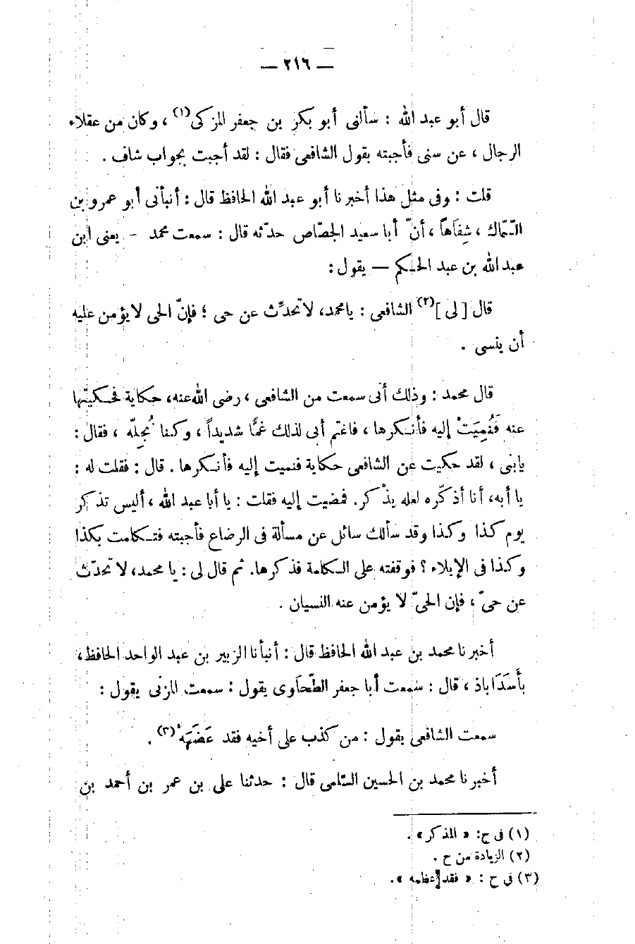 قال محمد: وذلك أني سمعت من الشافعي، رضي الله عنه، حكاية فحكيتها عنه فَنُمِيَتْ إليه فأنكرها، فاغتم أبي لذلك غمًّا شديداً، وكنا نُجِلّه، فقال: يا بني، لقد حكيت عن الشافعي حكاية فنميت إليه فأنكرها. قال: فقلت له: يا أبه، أنا أذكّره لعله يذْكر. فمضيت إليه فقلت: يا أبا عبد الله، أليس تذكر يوم كذا وكذا وقد سألك سائل عن مسألة في الرضاع فأجبته فتكلمت بكذا وكذا في الإيلاء؟ فوقفته على الكلمة فذكرها. ثم قال لي: يا محمد، لا تحدّث عن حيّ، فإن الحيّ لا يؤمن عنه النسيان.