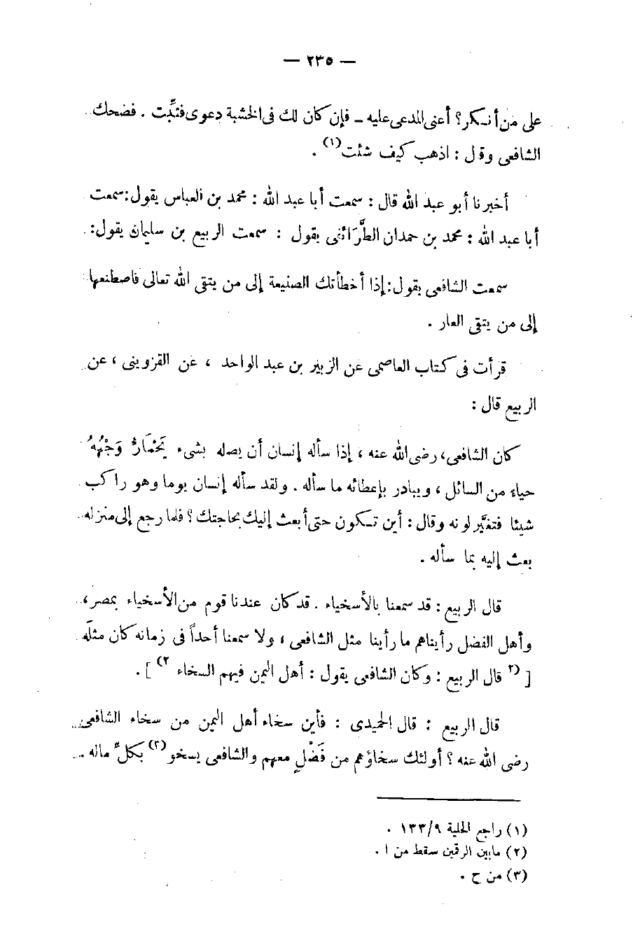 قال الربيع: قال الحميدي: فأين سخاء أهل اليمن من سخاء الشافعي رضي الله عنه؟ أولئك سخاؤهم من فَضْلٍ معهم والشافعي يسخو (٣) بكلِّ ماله.