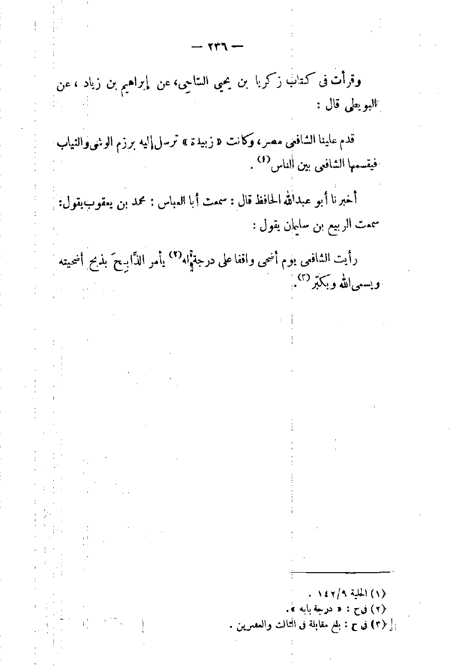 رأيت الشافعي يوم أضحى واقفا على درجة له (٢) يأمر الذَّابِحَ بذبح أضحيته ويسمي الله ويكبّر (٣).