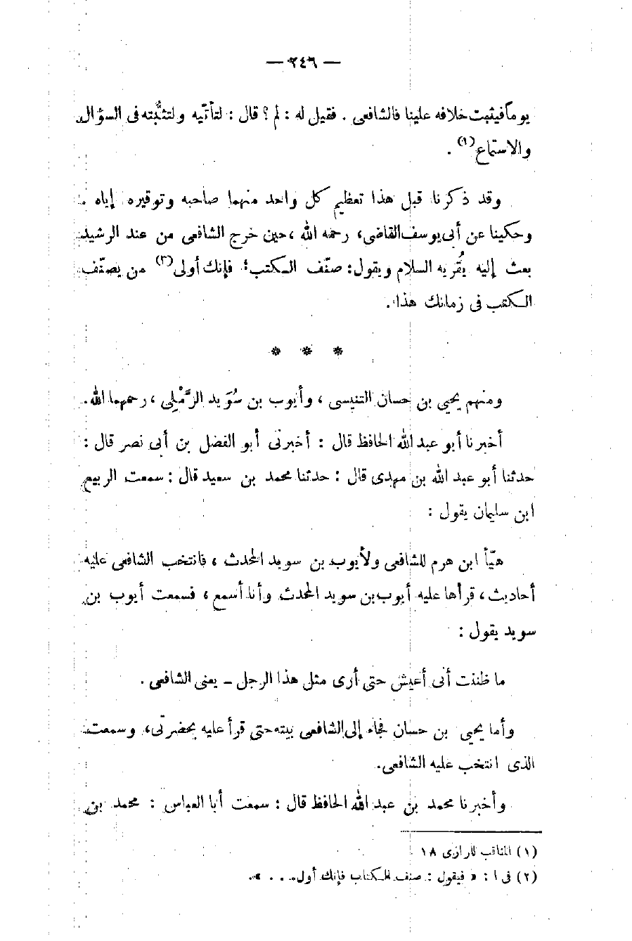 وقد ذكرنا قبل هذا تعظيم كل واحد منهما صاحبه وتوقيره إياه. وحكينا عن أبي يوسف القاضي، رحمه الله، حين خرج الشافعي من عند الرشيد بعث إليه يُقريه السلام ويقول: صنّف الكتب؛ فإنك أولى (٢) من يصنّف الكتب في زمانك هذا.