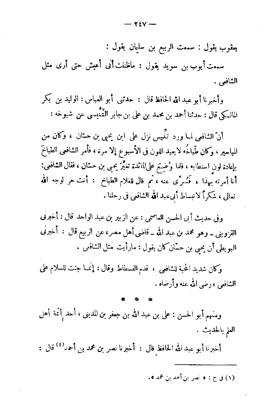 وفي حديث أبي الحسن العاصمي: عن الزبير بن عبد الواحد قال: أخبرني القزويني - وهو محمد بن عبد الله - قاضي أهل مصر، عن الربيع قال: أخبرني البويطي أن يحيى بن حسّان كان يقول: ما رأيت مثل الشافعي.