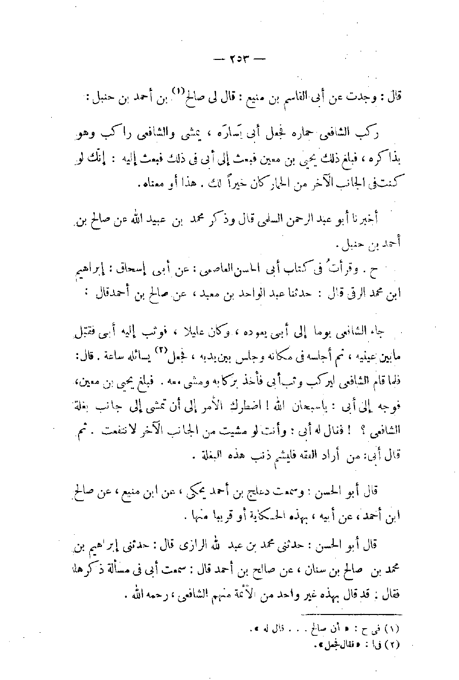 جاء الشافعي يوما إلى أبي يعوده، وكان عليلا، فوثب إليه أبي فقبّل ما بين عينيه، ثم أجلسه في مكان وجلس بين يديه، فجعل (٢) يسائله ساعة. قال: فلما قام الشافعي ليركب وثب أبي فأخذ بركابه ومشى معه. فبلغ يحيى بن معين، فوجه إلى أبي: يا سبحان الله! اضطرك الأمر إلى أن تمشي إلى جانب بغلة الشافعي؟ فقال له أبي: وأنت لو مشيت من الجانب الآخر لانتفعت. ثم قال أبي: من أراد الفقه فليشم ذنب هذه البغلة.
