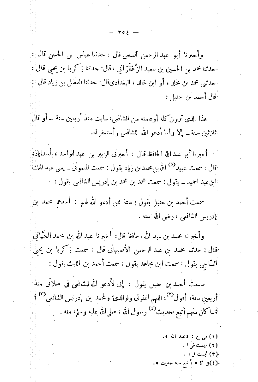 سمعت أحمد بن حنبل يقول: إني لأدعو الله للشافعي في صلاتي منذ أربعين سنة، أقول (٢): اللهم اغفر لي ولوالديّ ولمحمد بن إدريس الشافعي (٣)؛ فما كان منهم أتبع لحديث (٤) رسول الله، صلى الله عليه وسلم، منه.