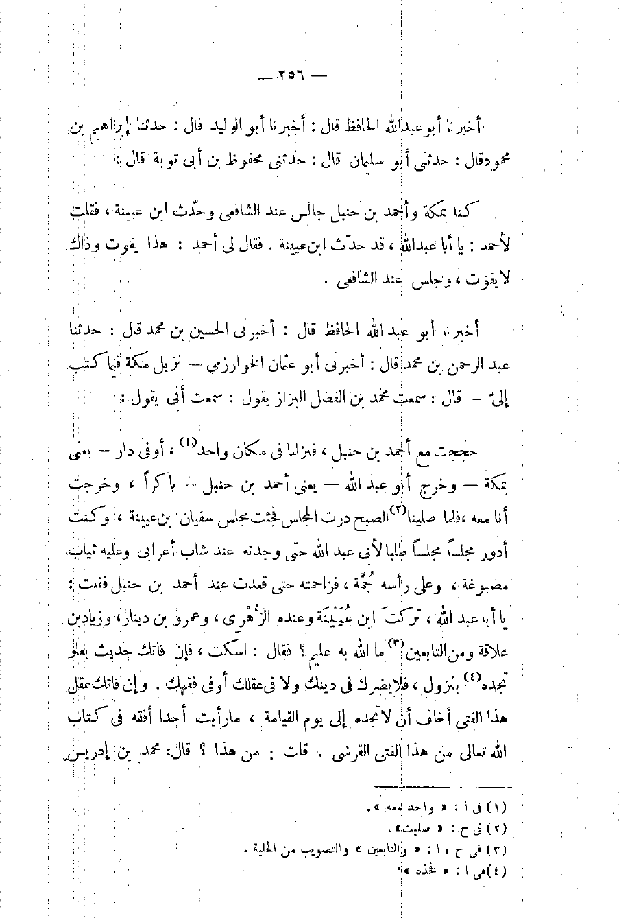 حججت مع أحمد بن حنبل، فنزلنا في مكان واحد (١)، أو في دار - يعني بمكة - وخرج أبو عبد الله - يعني أحمد بن حنبل - باكراً، وخرجت أنا معه، فلما صلينا (٢) الصبح درت المجلس فجئت مجلس سفيان بن عيينة، وكنت أدور مجلساً مجلساً طلبا لأبي عبد الله حتى وجدته عند شاب أعرابي وعليه ثياب مصبوغة، وعلى رأسه جُمَّة، فزاحمته حتى قعدت عند أحمد بن حنبل فقلت: يا أبا عبد الله، تركتَ ابن عُيَيْنَة وعنده الزُّهْرِي، وعمرو بن دينار، وزياد بن علاقة ومن التابعين (٣) ما الله به عليم؟ فقال: اسكت، فإن فاتك حديث بعلو تجده (٤) بنزول، فلا يضرك في دينك ولا في عقلك أو في فقهك. وإن فاتك عقل هذا الفتى أخاف أن لا تجده إلى يوم القيامة، ما رأيت أحدا أفقه في كتاب الله تعالى من هذا الفتى القرشي. قلت: من هذا؟ قال: محمد بن إدريس