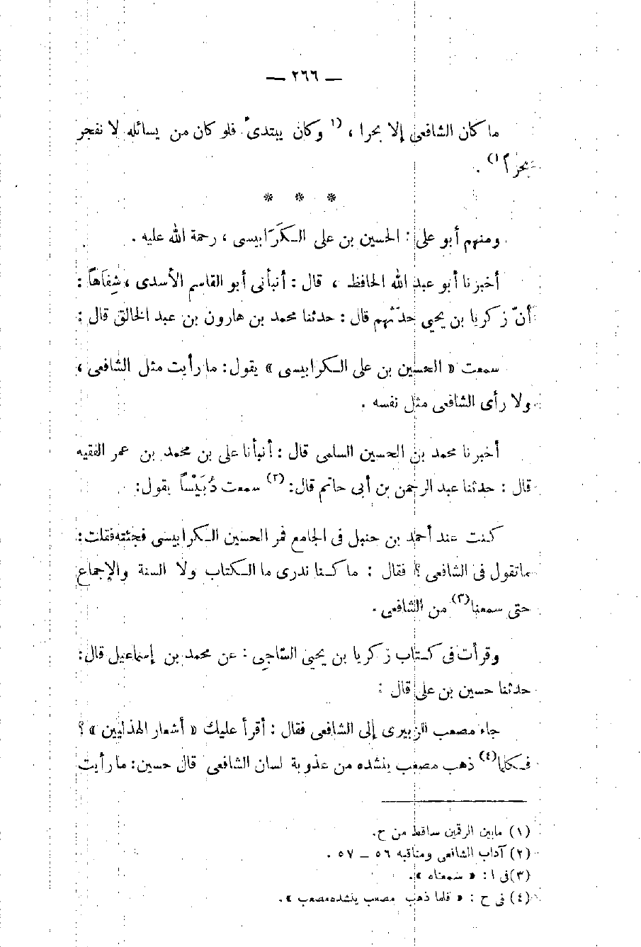 كنت عند أحمد بن حنبل في الجامع فمر الحسين الكرابيسي فجئته فقلت: ما تقول في الشافعي؟ فقال: ما كنا ندري ما الكتاب ولا السنة والإجماع حتى سمعنا (٣) من الشافعي.