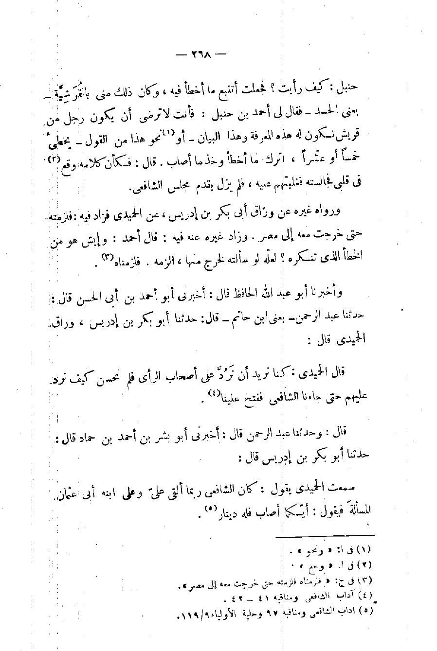 ورواه غيره عن ورّاق أبي بكر بن إدريس، عن الحميدي فزاد فيه: فلزمته حتى خرجت معه إلى مصر. وزاد غيره عنه فيه: قال أحمد: وإيش هو من الخطأ الذي تنكره؟ لعلّه لو سألته لخرج منها، الزمه. فلزمناه (٣).