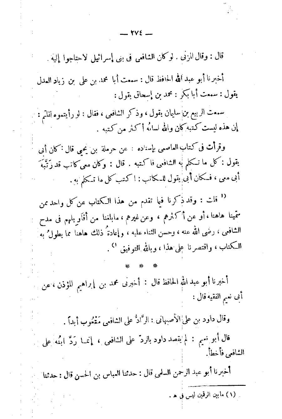 (١ قلت: وقد ذكرنا فيما تقدم من هذا الكتاب عن كل واحد ممن سمّينا هاهنا، أو عن أكثرهم، وعن غيرهم، ما بلغنا من أقَاوِيلهم في مدح الشافعي، رضي الله عنه، وحسن الثناء عليه، وإعادةُ ذلك هاهنا مما يطولُ به الكتاب، واقتصرنا على هذا، وبالله التوفيق ١).