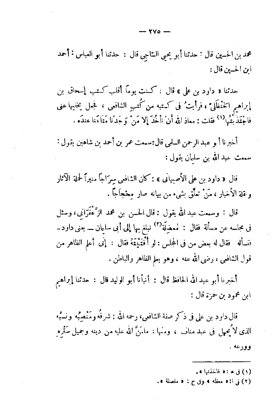 حدثنا «داود بن علي» قال: كنت يوماً أقلب كتب إسحاق بن إبراهيم الحَنْظَليّ، فرأيتُ من كُتبِ الشافعي، فجعل يخفيها عني فاجْتَذَبْتُها (١) فقلت: معاذ الله أَنْ نأخُذَ إلا مَنْ وَجَدْنا مَتَاعَنا عندَه.