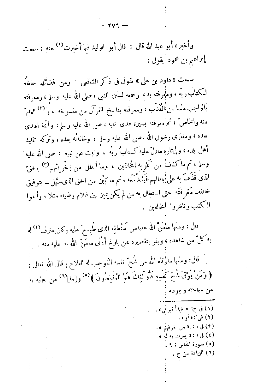 سمعت «داود بن علي» يقول في ذكر الشافعي: ومن فضائله حفظُه لكتاب ربّه، ومعرفته به، وجمعه لسنن النبي، صلى الله عليه وسلم، ومعرفته بالواجب منها من النَّدْب، ومعرفته بناسخ القرآن من منسوخه، و (٢) العامّ منه والخاصّ، ثم معرفته بسيرة هدى نبيه، صلى الله عليه وسلم، وأئمة الهدى بعده، ومغازي رسول الله، صلى الله عليه وسلم، وخلفائه بعده، وتركه تقليد أهل بلده، وإيثاره ما دلّ عليه كتابُ ربّه، وثبت عن نبيه، صلى الله عليه وسلم، ثم ما كشف من تَمْوِيه المخالفين، وما أبطل من زخْرفِتهم (٣) بالحقّ الذي قَذَفَ به على باطلهم فَيْدْمَغُه، ثم ما بَيَّن من الحق الذي سهَّل - بتوفيق خالقه - مَعْرِفَته حتى استطال به من لم يكن يميز بين ظلام وضياء مثلا، وألفوا الكتب وناظروا المخالفين.