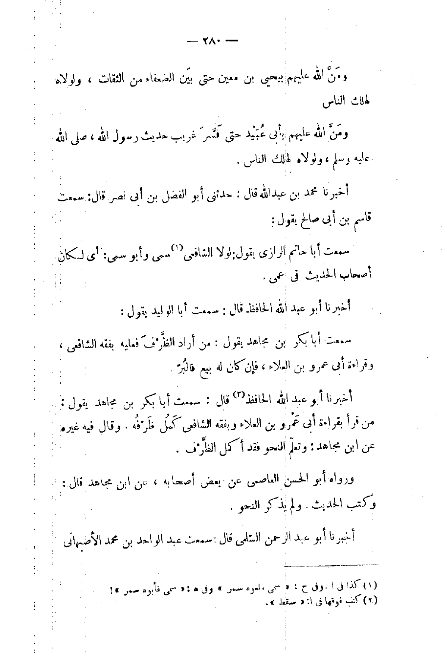 ورواه أبو الحسن العاصمي عن بعض أصحابه، عن ابن مجاهد قال: وكتب الحديث. ولم يذكر النحو.