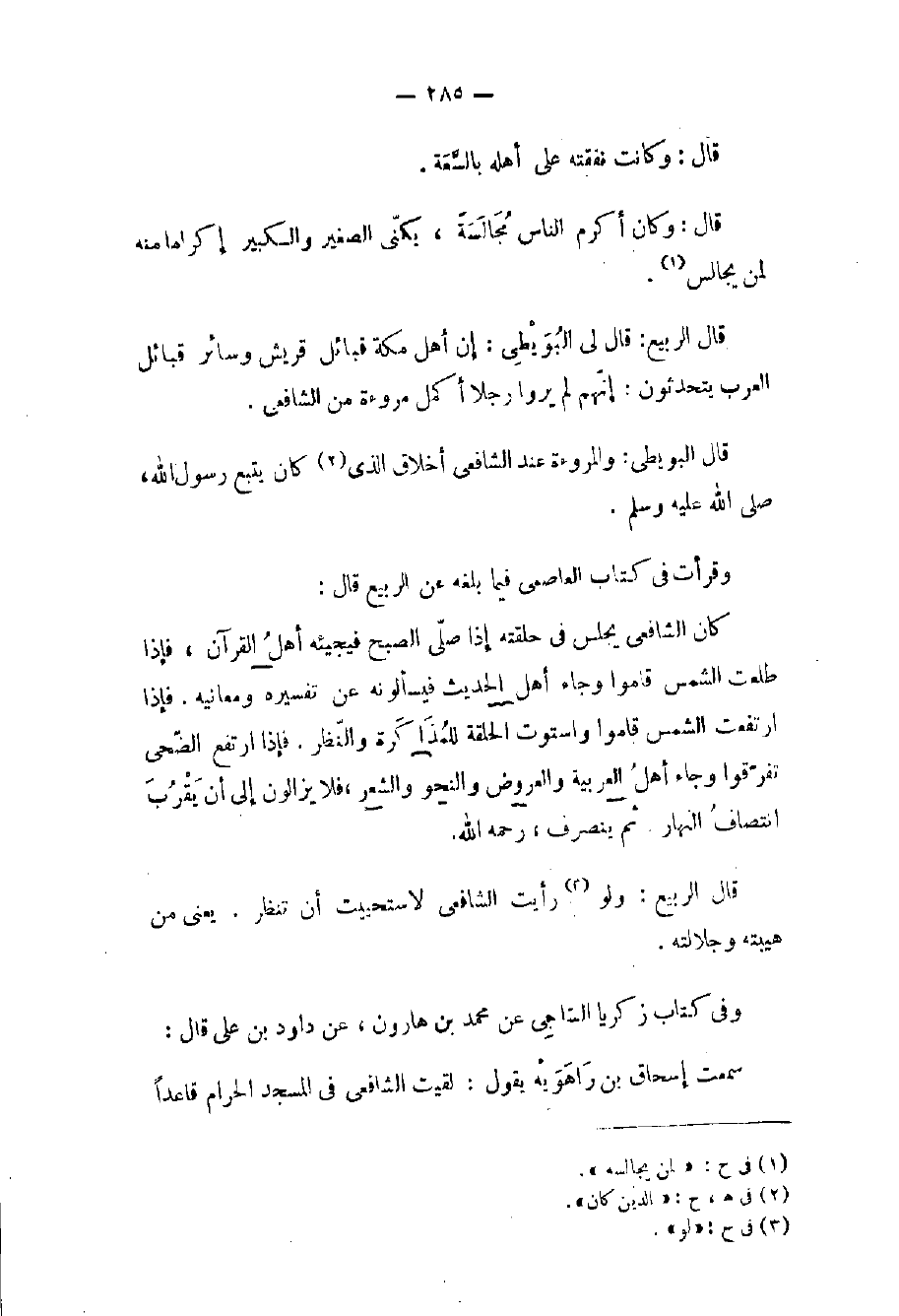 كان الشافعي يجلس في حلقته إذا صلّى الصبح فيجيئه أهلُ القرآن، فإذا طلعت الشمس قاموا وجاء أهل الحديث فيسألونه عن تفسيره ومعانيه. فإذا ارتفعت الشمس قاموا واستوت الحلقة للمُذَاكَرة والنّظر. فإذا ارتفع الضّحى تفرّقوا وجاء أهلُ العربية والعروض والنحو والشعر، فلا يزالون إلى أن يَقْرُبَ انتصافُ النهار. ثم ينصرف، رحمه الله.